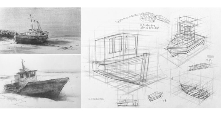 This article details a sketching class on drawing a fishing boat using basic geometric shapes.