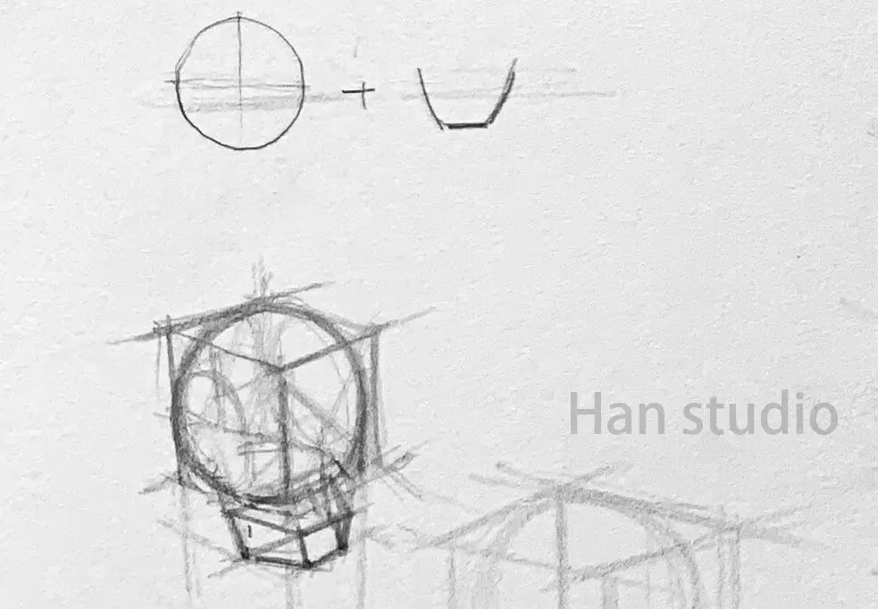 We can think of the head as a combination of a circle and an inverted trapezoid, with the circle representing the skull-like shape and the inverted trapezoid representing the mandible, as shown in the small diagram on the lower left.