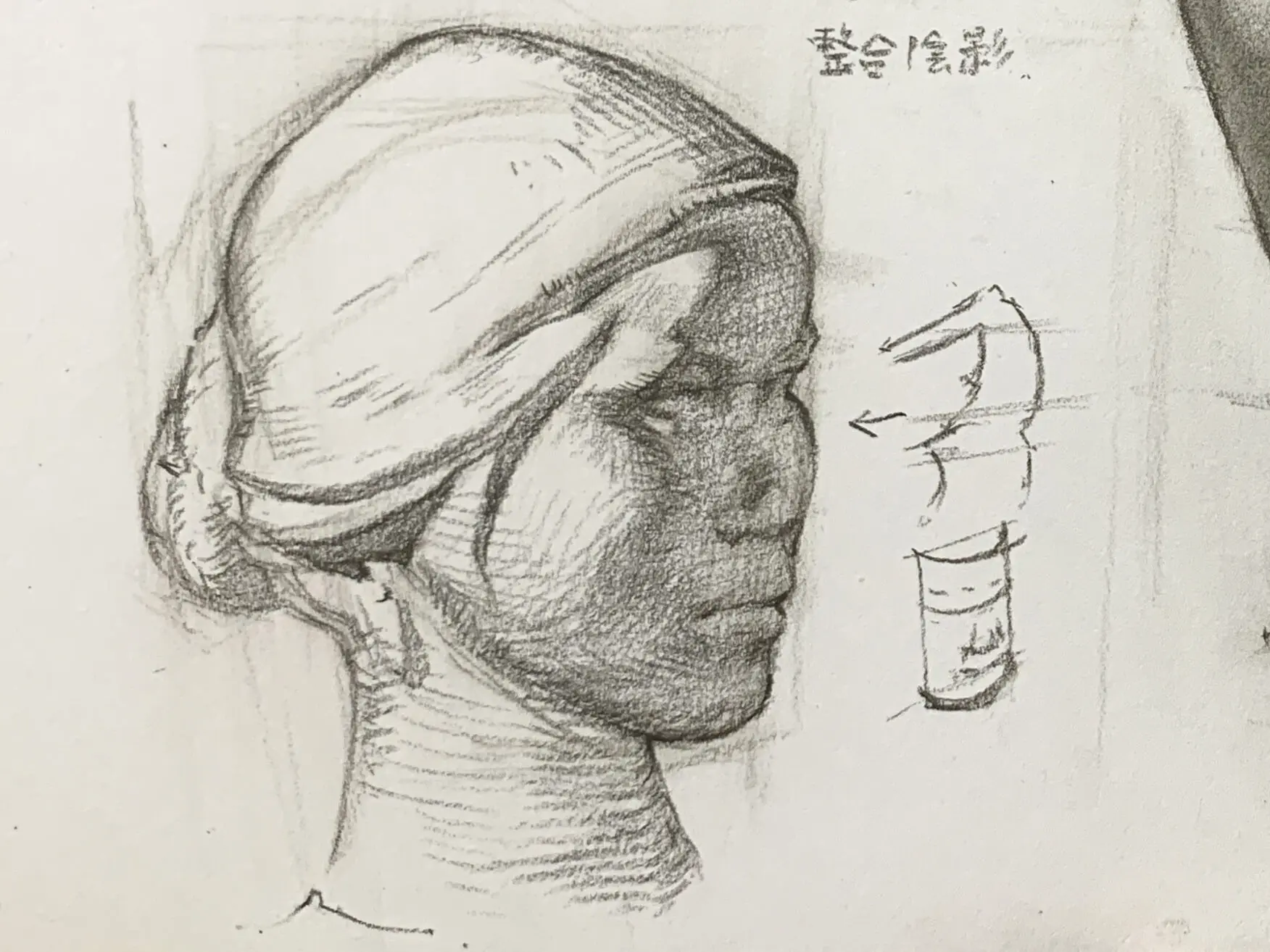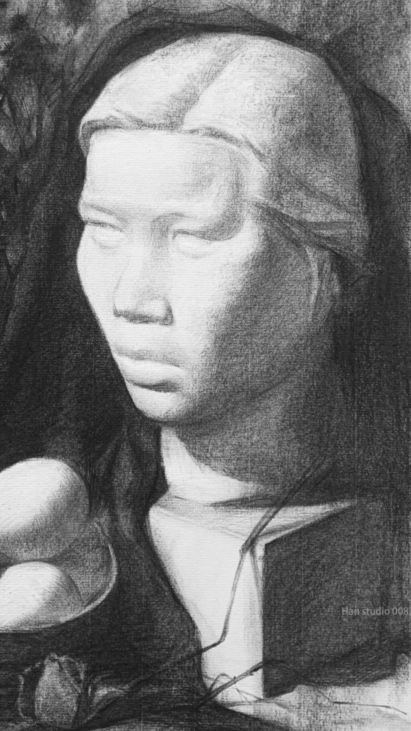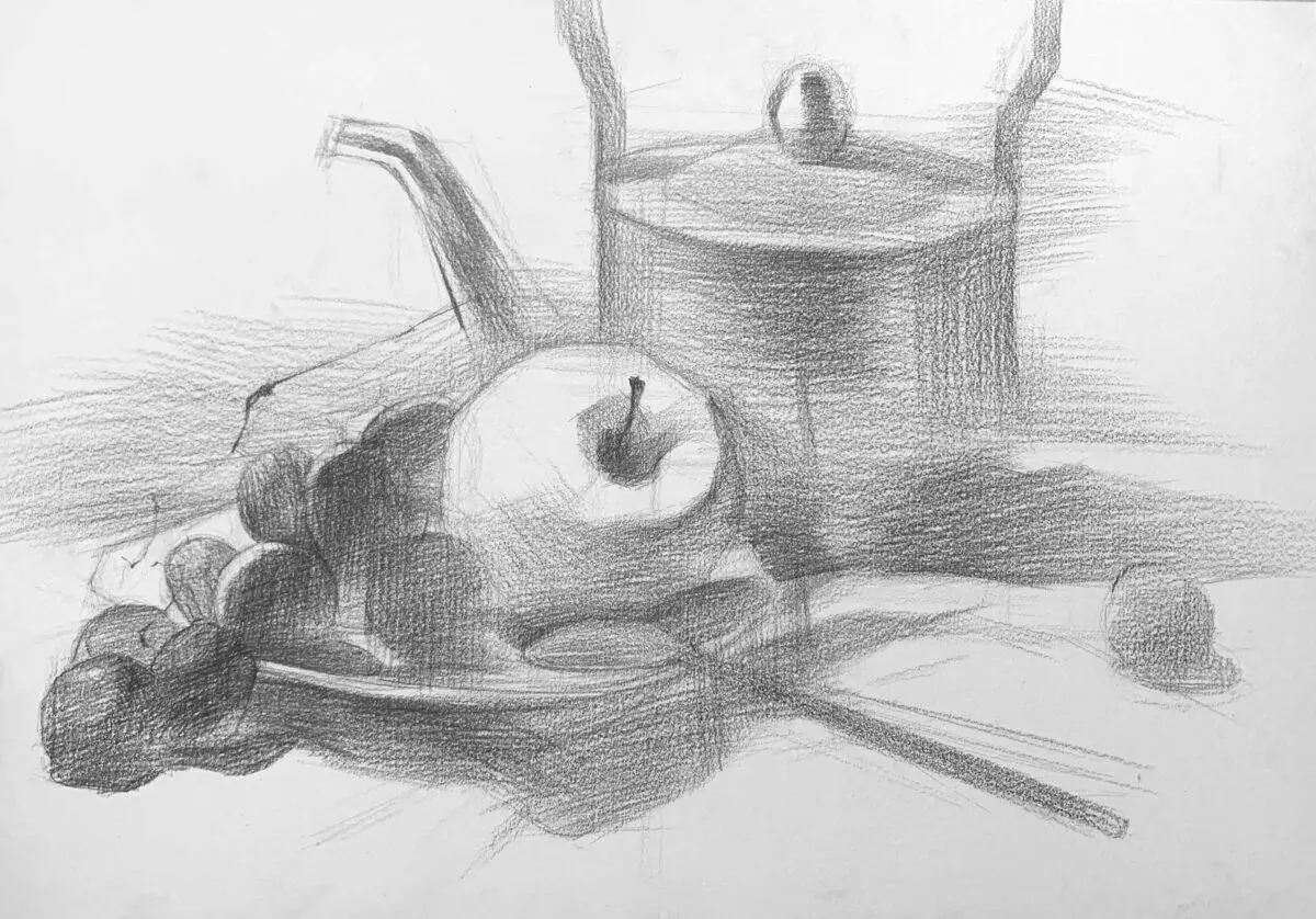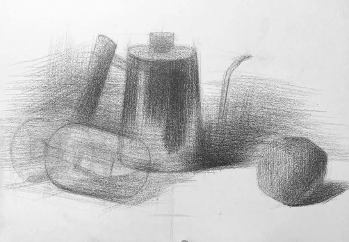 Record headshot still-life group work, practicing making faint bright surface ups and downs.