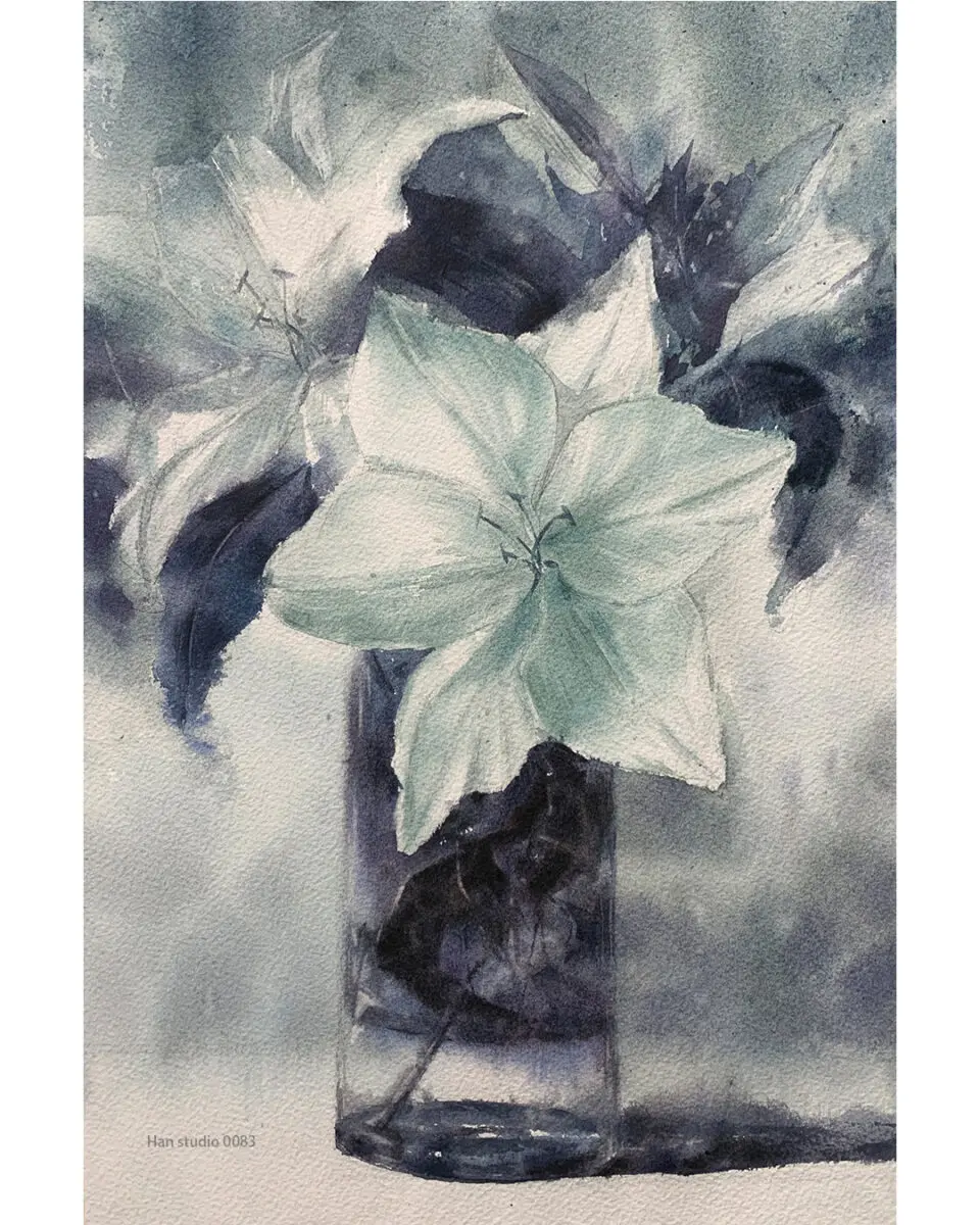 Use complementary or cool colors to express the colors after the area transition, the red lily's shadow with seawater blue and sage red, ivory black.
