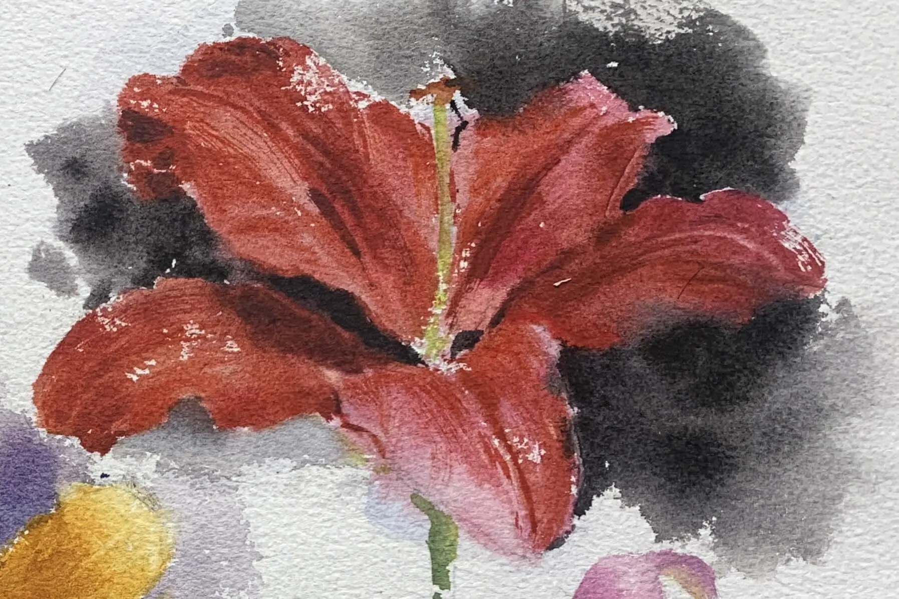 Pink with red lilies: Pink flower highlights can be lightened with cadmium red + water.