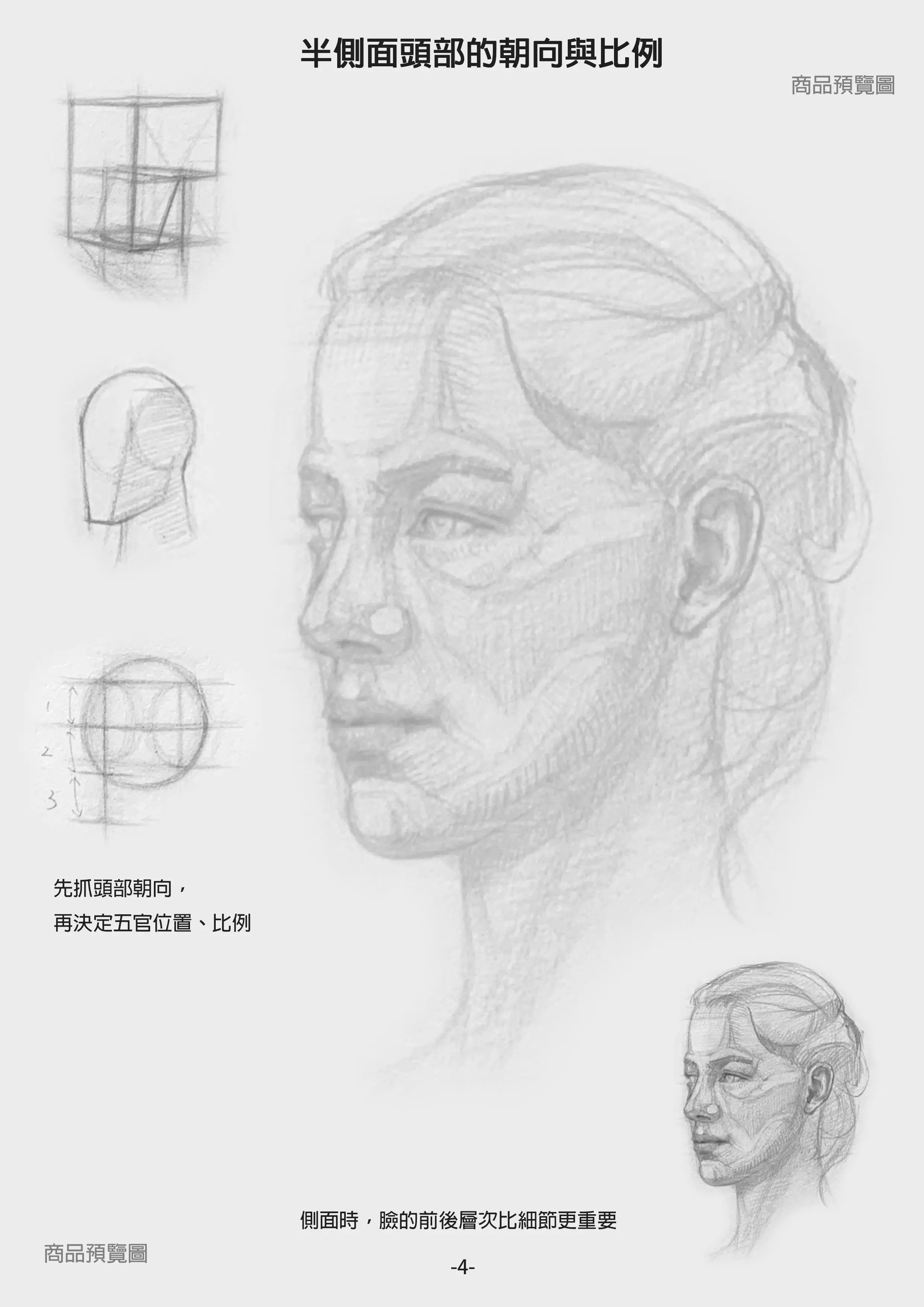 內容從彩色原圖比例分析開始,幫助理解頭型、上中下分段、鼻口位置與臉部朝向,再搭配灰底稿描圖練習,整理正面、半側面、男性頭部與仰角下的面轉折。