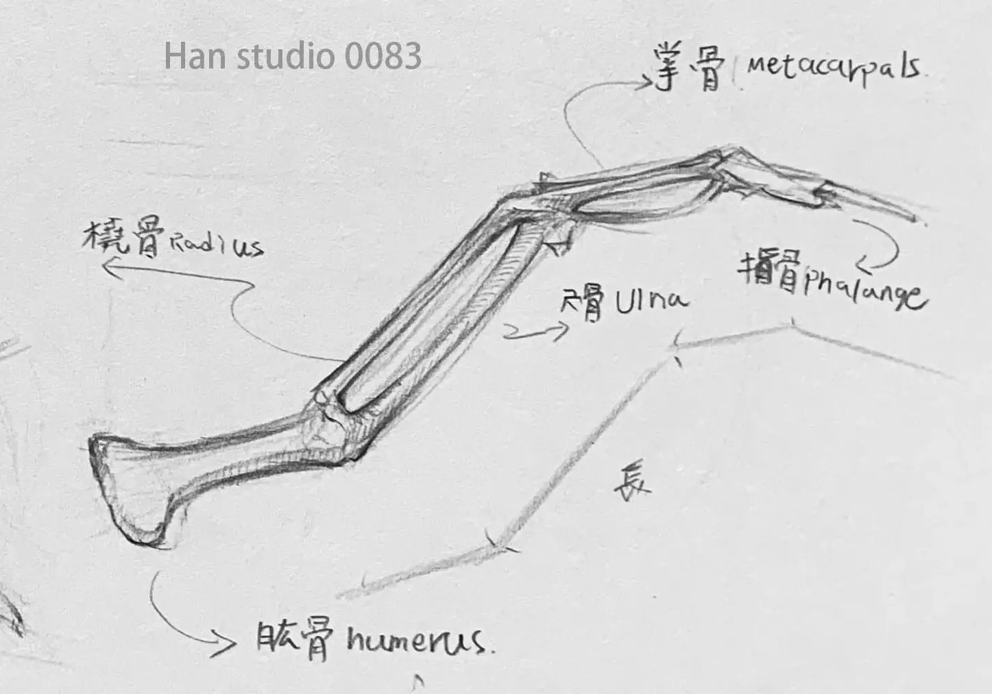 翅膀由肩部到指骨逐漸延展,主要的翅膀骨骼(肱骨、尺骨、橈骨)。