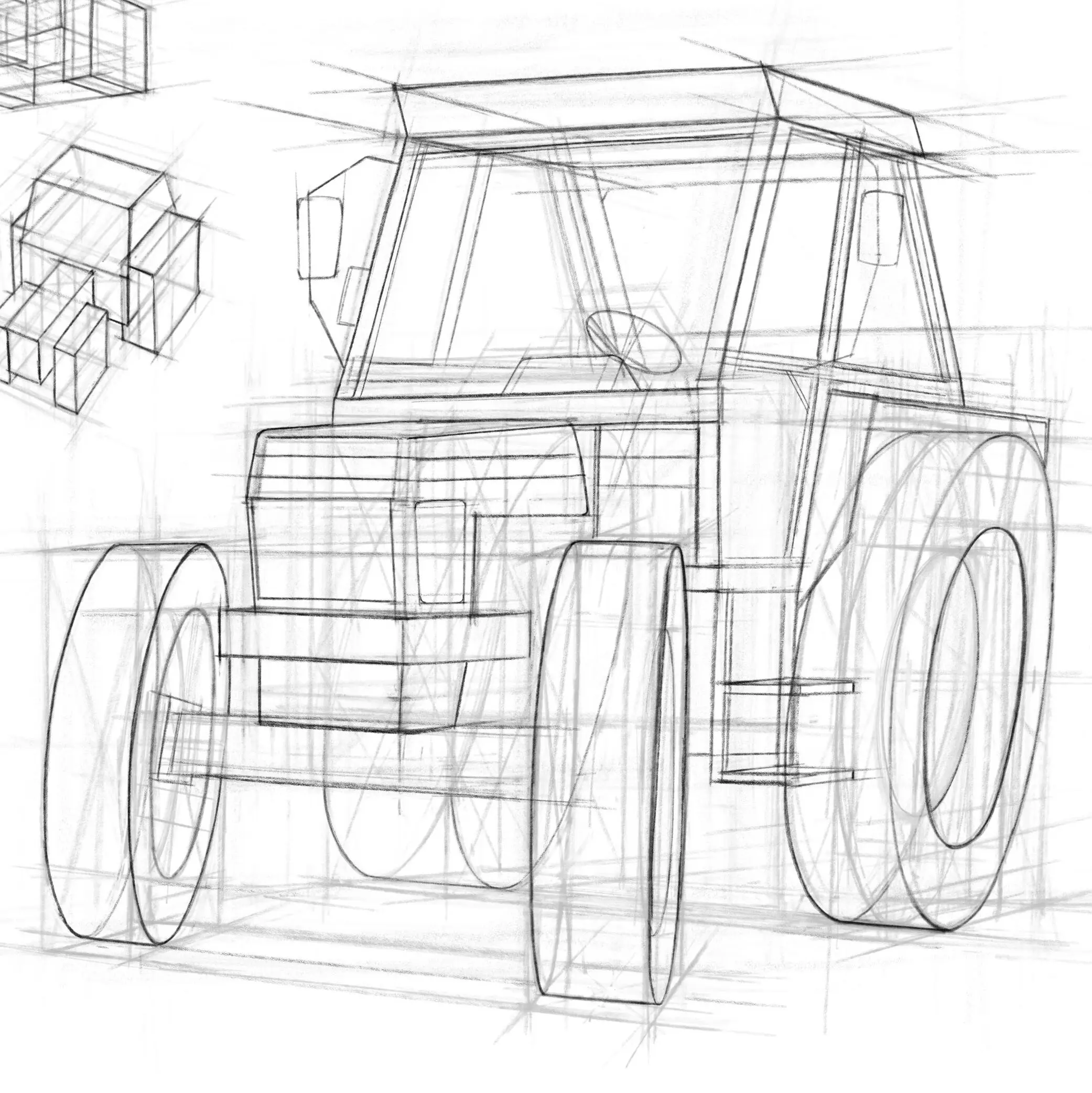 拖拉機使用兩點透視,左右車輪與車身前後的透視線指向兩個不同的消失點。