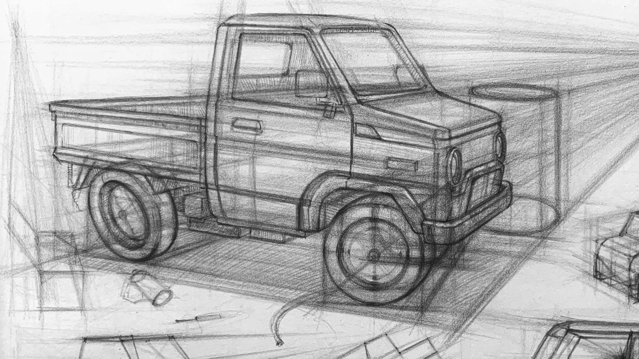 - 初稿:以輕描線條為主,大概抓出車身的結構和透視。