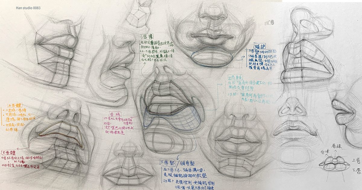 - 分塊灰階素描:將上唇體、下唇體、人中、頦溝分開練習