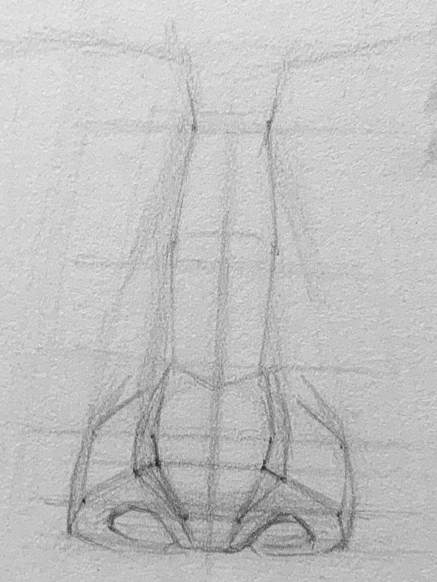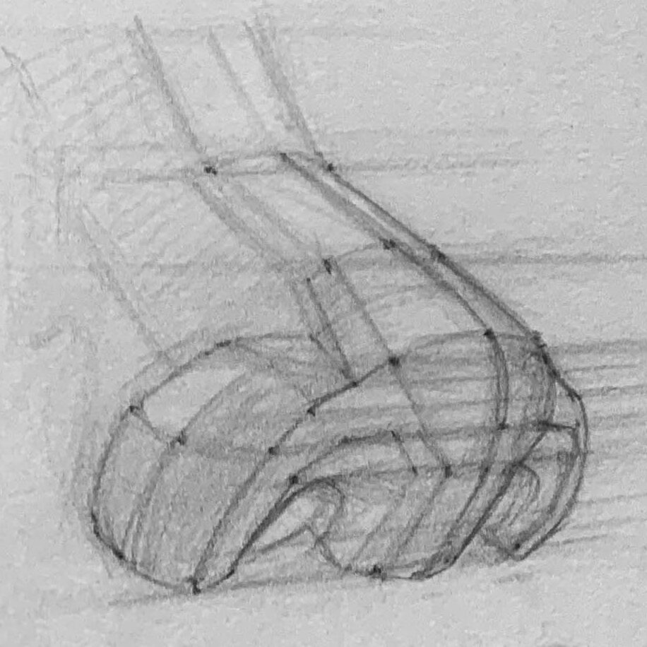 鼻子是「由平面到圓形」的過渡,簡單理解成:(鼻樑長方 → 鼻頭球形 → 鼻翼弧線)