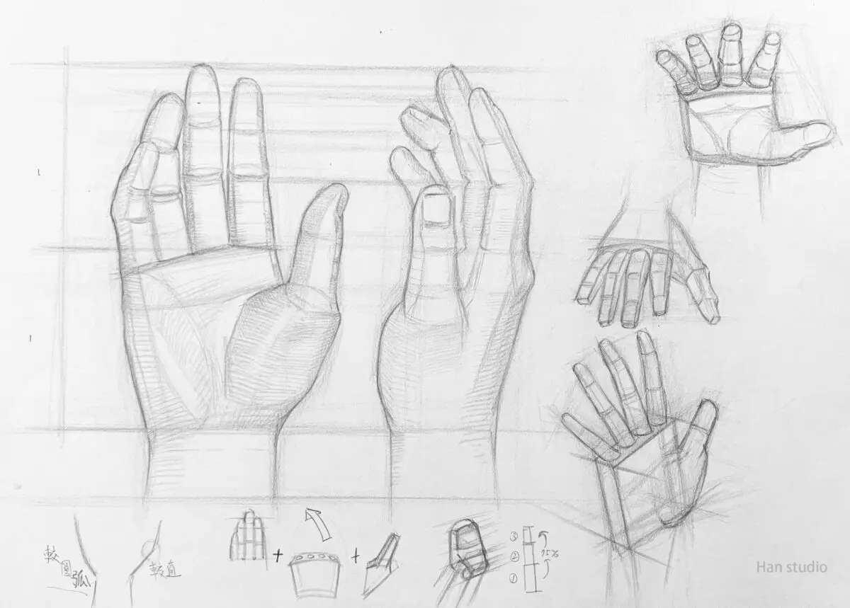 – 在手掌和手指上添加關節和結構線,在畫的時候觀察因為形狀轉折,產生陰影的地方,可以參考左邊正面、側面大圖。