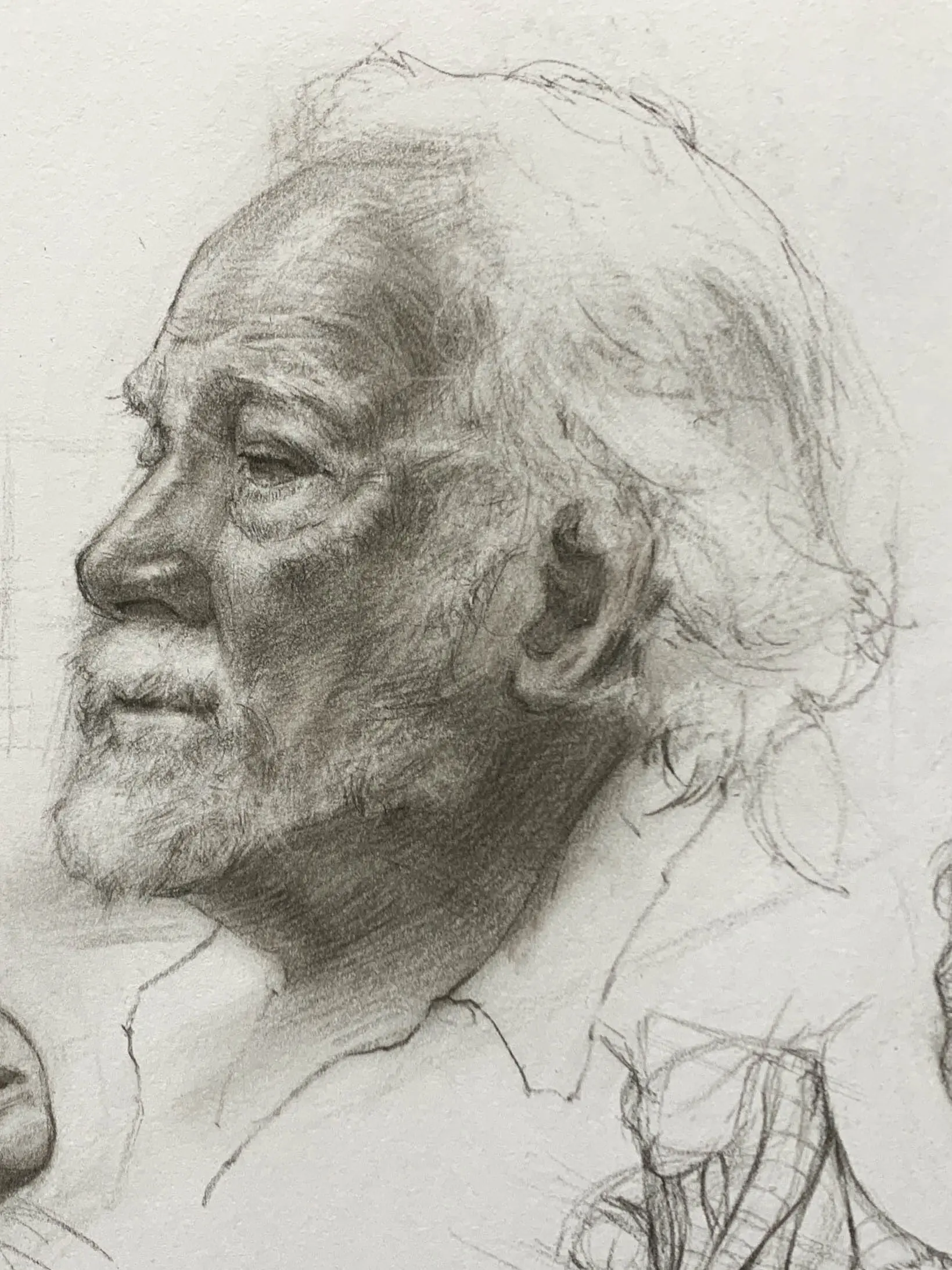 年老人在皮膚皺褶上會比較明顯,在素描光影表現上會比較豐富好呈現