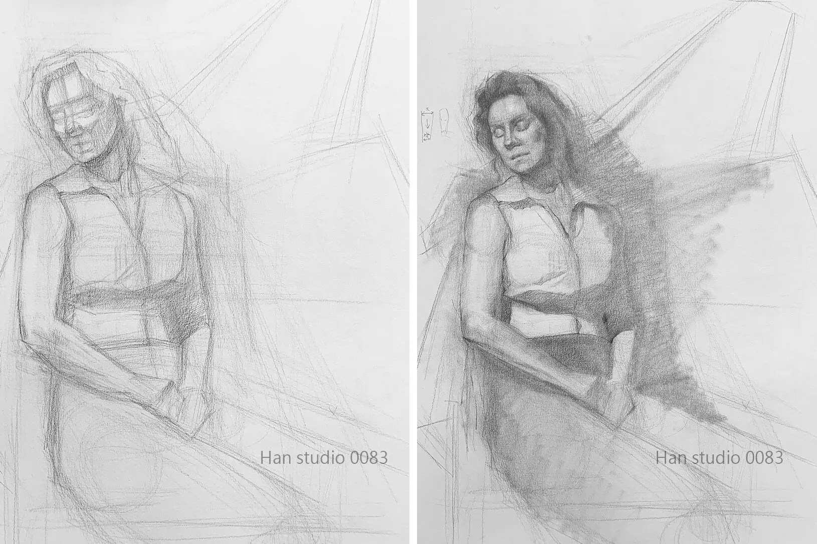 上明暗注意,亮面與暗面形狀分佈,簡化過多細節(左圖)