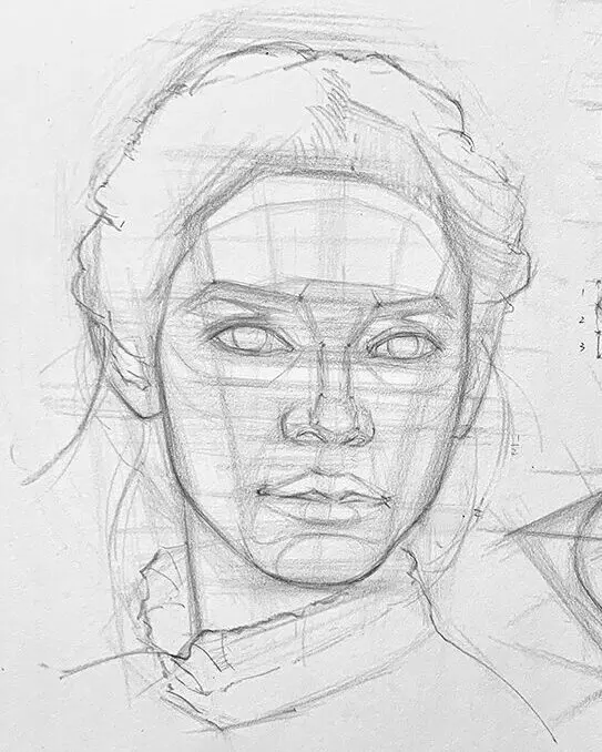 - 套用臉部三等分(髮際→眉弓→鼻下→下巴)來決定大致高度,再逐步細化形狀。