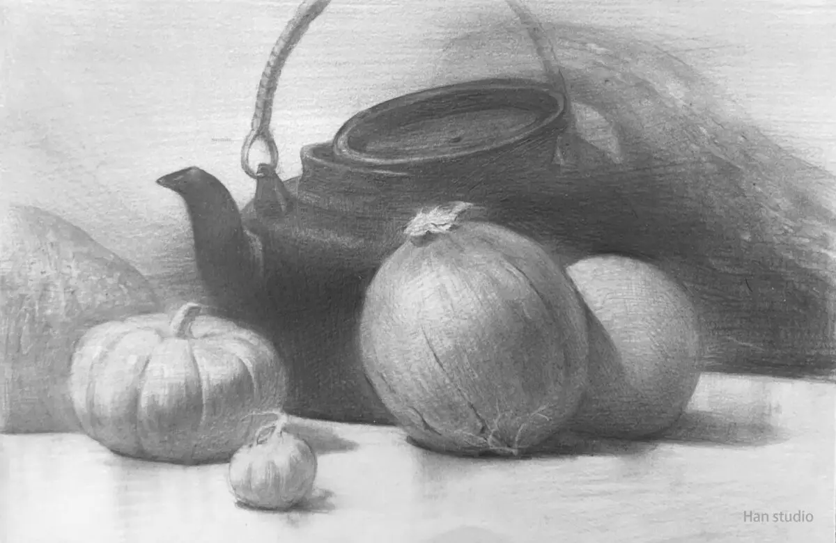 物件彼此會因為固有的顏色產生明度差異,像是黃南瓜與黑色茶壺。