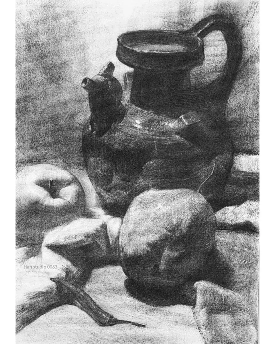 這週炭筆素描課堂習作,向學生介紹物件打光後明度之間差異,下半段會介紹壺知識點及怎麼畫,如果有興趣的畫友一起繼續往下看,配合著第二張圖比較容易理解喔