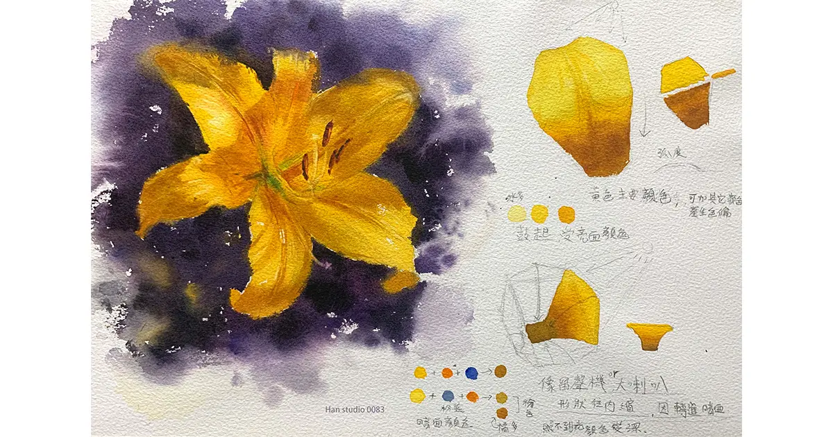 探討如何畫出百合花的形態與光影變化,重點包括花瓣的基本結構、色彩明暗關係、背景處理與配色技巧。